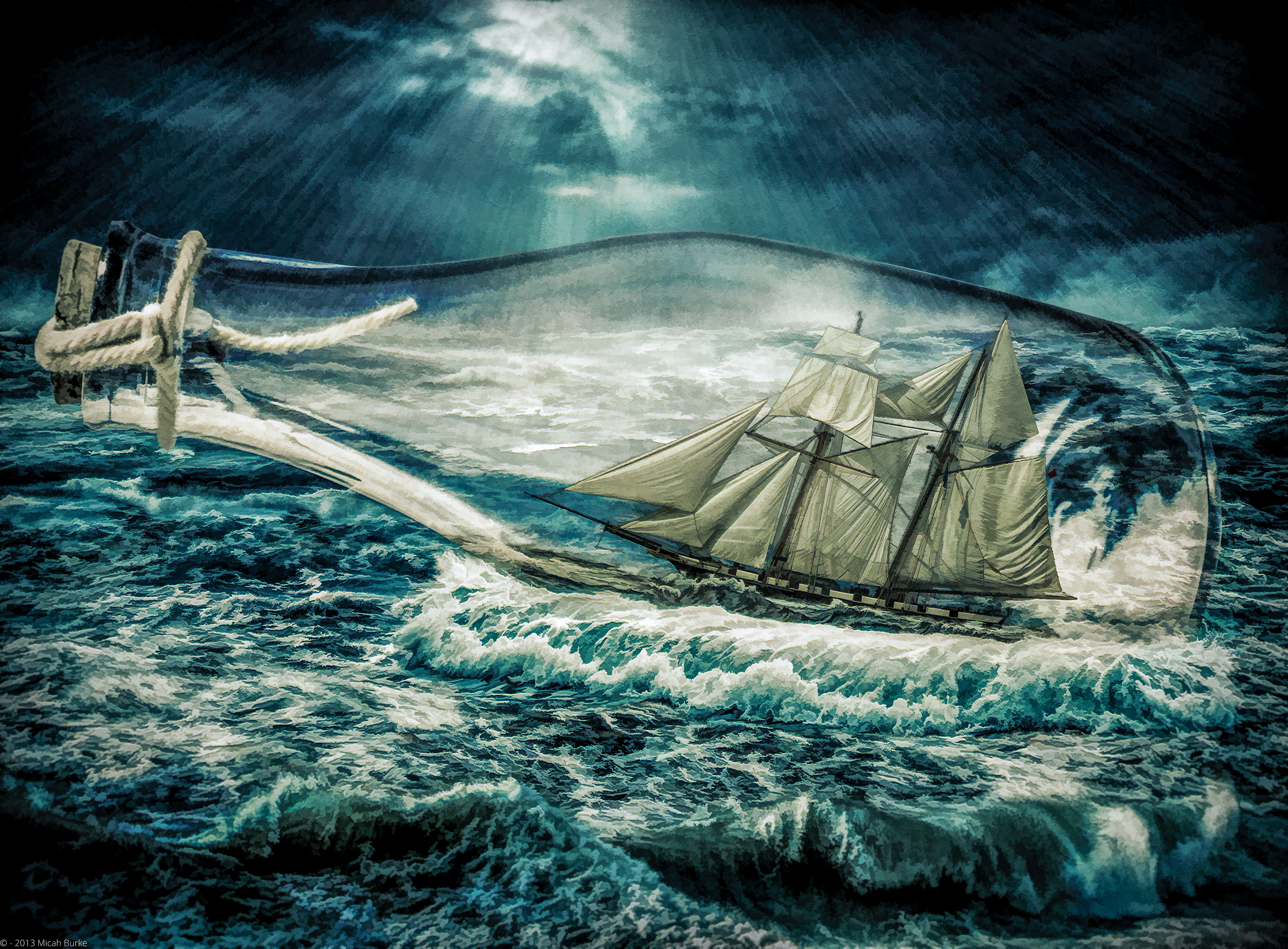 Inspired by my father who is a shipwright, I chose to create a ship-in-a-bottle on the ocean. The seas in the bottle seem much less rough!